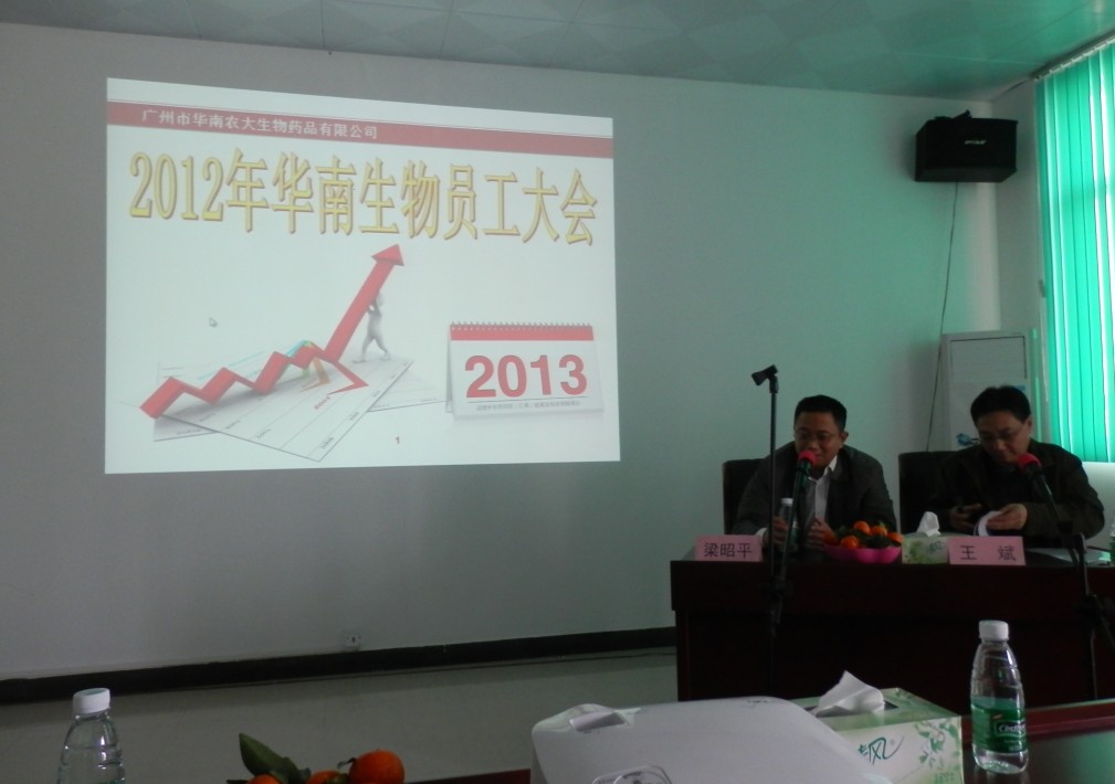 1月24日,華南生物2012年員工大會在辦公樓一樓會議室順利召開。王斌副總經理主持了本次會議,梁昭平總經理在會議上匯報了2012年度公司的經營情況、主要亮點工作及主要完成工作內容。梁總在現場講話中,感謝全體員工一年來對公司所做出的積極付出,充分肯定了華南生物員工在2012年里所取得的優異成績,并為企業描繪發展藍圖,鼓勵大家共同努力,取得新的輝煌。在肯定上一年度工作成績的同時,提出了企業在發展上存在的問題與改進辦法,展望未來一年的方向和目標,對新一年寄予了熱切的期盼。