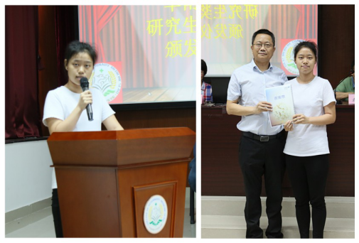 獲獎代表朱夢嬌同學發言,向華南生物表示敬意及感謝,承諾以后更加努力學習,時刻鞭策自己,以取得更加優異的成績并投桃報李。