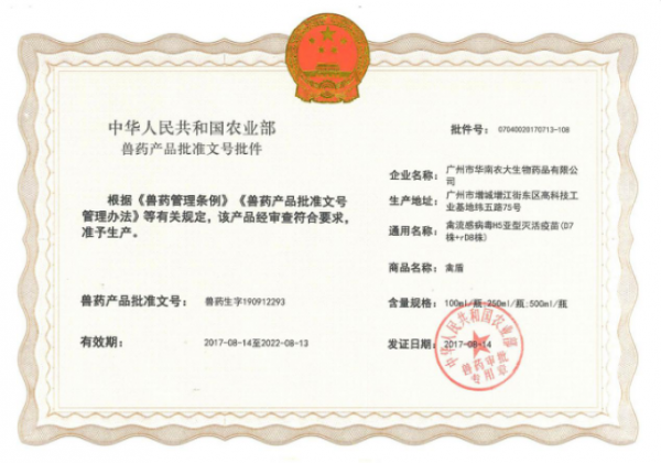 2017年8月14日,由華南農(nóng)業(yè)大學(xué)、中國(guó)獸醫(yī)藥品監(jiān)察所、廣州市華南農(nóng)大生物藥品有限公司(以下簡(jiǎn)稱(chēng)“華南生物”)共同研發(fā)的禽流感病毒H5亞型滅活疫苗(D7株+rD8株)通過(guò)農(nóng)業(yè)部獸藥產(chǎn)品批準(zhǔn)文號(hào)的審批,喜獲得農(nóng)業(yè)部核發(fā)的獸藥產(chǎn)品批準(zhǔn)文號(hào)——獸藥生字190912293;商品名:禽盾。