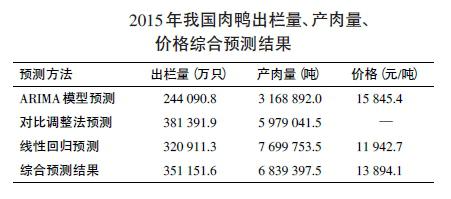 由于2013年受人感染H7N9流感事件的沖擊而價(jià)格和生產(chǎn)量均有所下降,進(jìn)入2014年一直處于反彈增長趨勢,而且這一趨勢還會(huì)在2015年持續(xù)一段時(shí)期,因此,根據(jù)3種預(yù)測方法綜合預(yù)測:2015年肉鴨的出欄量為35.1152億只,較2013年增長14.55%;產(chǎn)肉量683.94萬噸,較2013年增長9.02%;白條鴨價(jià)格為13 894.1 元/噸,較2013年增長5.82%,在11 942.7~15 845.4元/噸波動(dòng)。根據(jù)預(yù)測結(jié)果分析,2015年肉鴨產(chǎn)業(yè)將呈現(xiàn)平穩(wěn)增長的態(tài)勢。