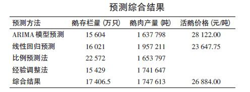 采用4種方法預(yù)測2014年鵝存欄量、鵝肉產(chǎn)量,以及2種方法預(yù)測2014年的活鵝價(jià)格(見表)。根據(jù)4種方法計(jì)算出的2014年鵝存欄量的平均值為17 406.5萬只,鵝肉產(chǎn)量為1747 613噸,鵝價(jià)格為26 884元/噸。另外,參照揚(yáng)州大學(xué)徐琪根據(jù)我國鵝品種統(tǒng)計(jì)的鵝年存欄量21195萬只,可以估算出2014 年我國鵝年存欄量將處在1.7億~2.1億只之間。因此,上述綜合預(yù)測結(jié)果是可信的。