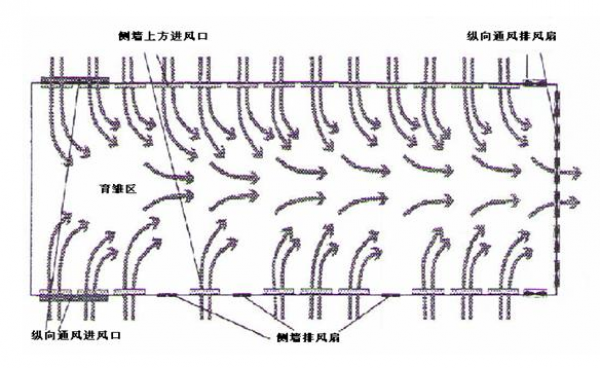 這種相對較新的通風(fēng)方法就是所謂的“過渡期通風(fēng)”,如下圖,其優(yōu)點(diǎn)是能在溫度上下波動比較大或內(nèi)部環(huán)境變化較大的情況下進(jìn)行良好的通風(fēng)。進(jìn)行這樣的通風(fēng)時,我們可以關(guān)閉雞舍前端為縱向通風(fēng)而設(shè)計(jì)的進(jìn)風(fēng)口,開啟一半或較少的風(fēng)機(jī)讓新鮮空氣從雞舍側(cè)墻上方的進(jìn)風(fēng)口進(jìn)入。這樣做的好處是既能進(jìn)行有效的通風(fēng)又能改善雞舍內(nèi)空氣均勻混合,而且避免雞群受到冷應(yīng)激。