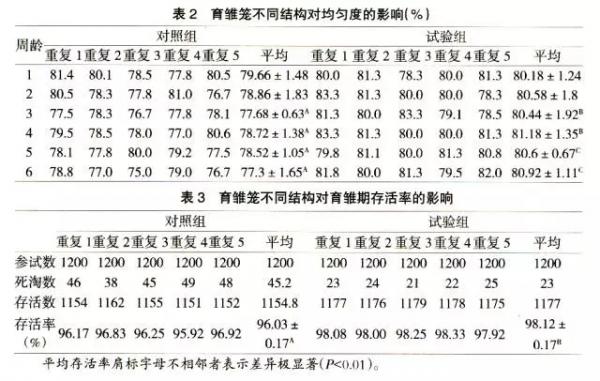 3.2 育雛籠不同結(jié)構(gòu)對育雛期均勻度和存活率的影響