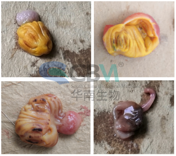 患雞吐口水,拉飼料便,逐漸消瘦;產(chǎn)蛋率下降,種蛋受精率下降,孵化后期(18天齡)死胚增多,孵出弱雛增多,死亡增多;種蛋大小不一,蛋殼質(zhì)量變差,破殼蛋、軟殼蛋增多,血斑蛋、霉斑蛋增多。