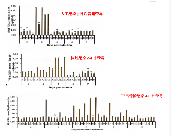 1.2通過隔離器進行人工感染后的同居感染試驗和空氣傳播感染試驗,結果表明病毒可以通過接觸傳播和空氣傳播!