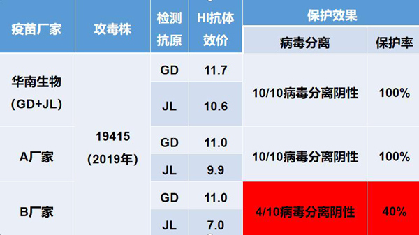 攻毒保護試驗表明,使用華南生物(GD+JL)2019年H9N2疫苗株對流行毒株的攻毒保護率均為100%,明顯優于其它競爭廠家,見下圖: