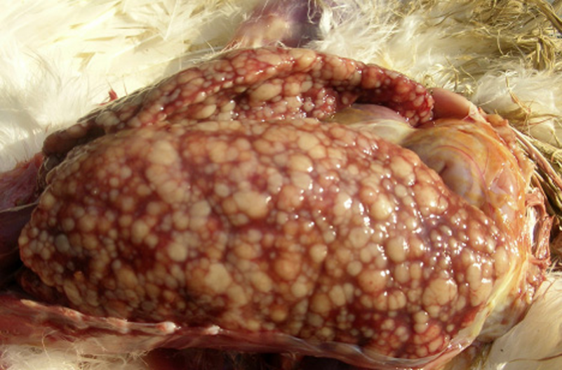 5、禽弧菌性肝炎:肝臟腫大,慢性病例在肝臟的表面和實質內有黃色、星芒狀的小壞死灶或布滿菜花狀的大壞死區,急性病例肝臟被膜脫落肝臟出血,腹腔內有多量血水。