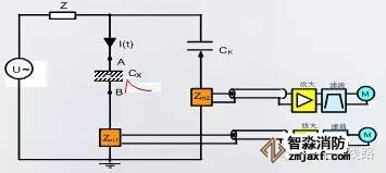 在被試驗電纜Cx注入標準局放信號Qo以模擬被試對象發生了局部放電,當標準局放信號注入時,檢測阻抗Zm1、Zm2輸出信號,測試系統M獲取局放信號的幅值大小、相位分布特征、頻譜特性等信息。
